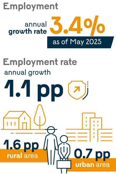 - As a result, the national employment to population ratio (EPR) grew by 1.1 percentage points (pp) annually, driven by a 1.6 pp increase in the rural EPR, while the urban EPR increased at a moderate rate of 0.7 pp.