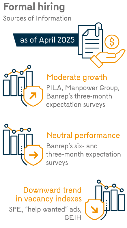 - In line with the slower growth of salaried employment, other formal information sources, such as contributions of salaried workers in the social security administrative records (PILA by its acronym in Spanish), show moderate growth in formal hiring as of April.