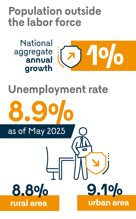 - As a result, the labor force participation rate (LFPR) for the national aggregate remained stable (0.1 pp), while the urban LFPR fell by 0.3 pp annually.