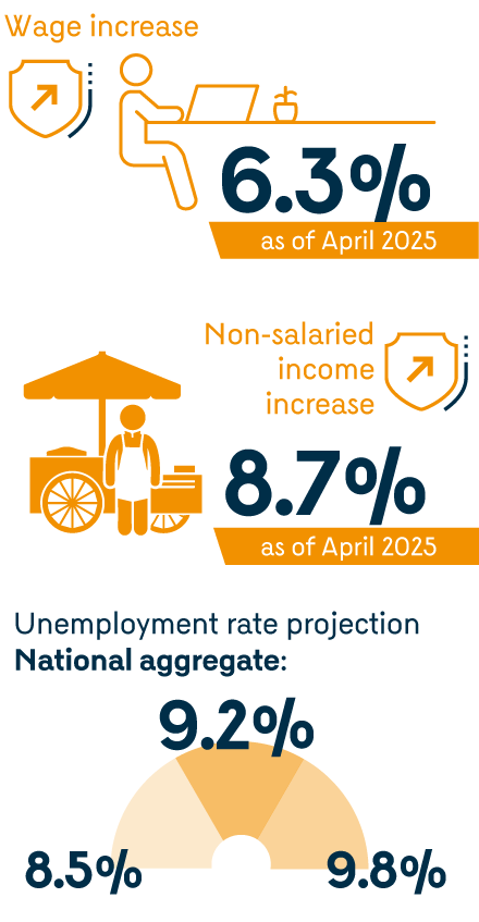 - In line with this and considering growth forecasts by Banrep's Monetary Policy and Economic Information Office (SGPMIE in Spanish), as stated in the Monetary Policy Report (MPR, July 2025), the urban UR is expected to average between 8.5% and 9.8%, with 9.1% as the most likely value.