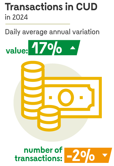 - In 2024, Banco de la República’s (the Central Bank of Colombia) large-value payment system (Deposit Accounts System, CUD by its Spanish acronym) exhibited greater dynamism. The average daily value of settled transactions increased by 17% vis-a-vis the previous year, despite a slight 2.0% decline in the volume of transactions. This outcome reflected shifts in money market liquidity conditions, which stimulated the sell/buy back transactions market and raised the usage of the Bank's liquidity absorption facility.