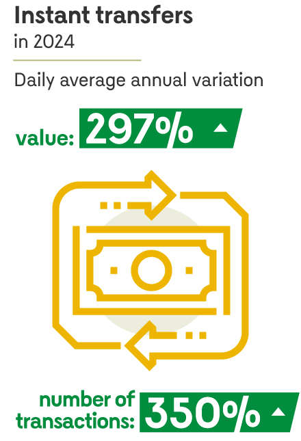- Instant transfers continued their rapid expansion, marked by the immediate availability of funds to recipients. Compared to the previous year, transaction numbers increased by nearly 350%, while transaction values grew by 297%.