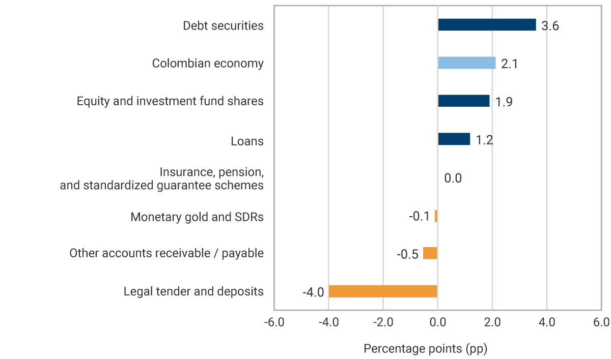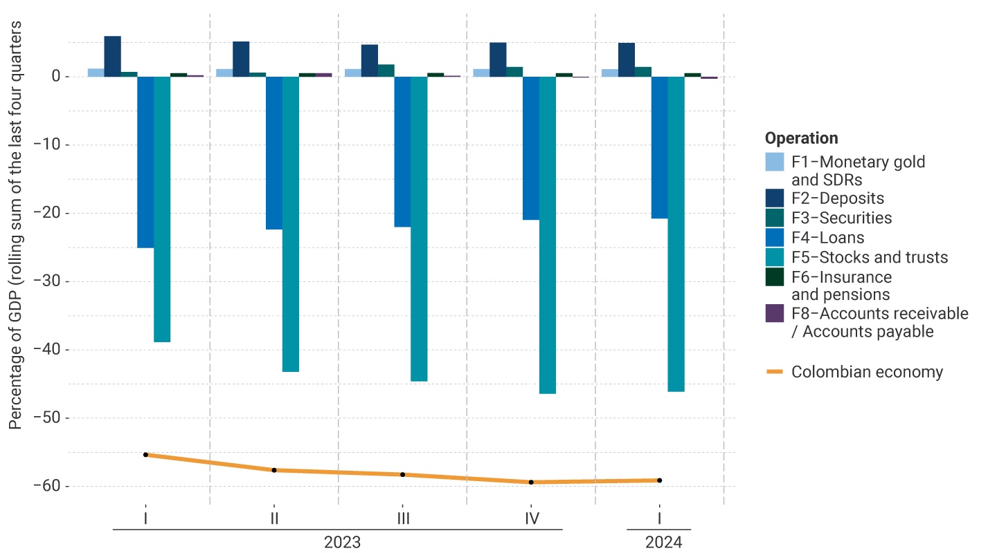 At the end of the first quarter of 2024, the net debtor position of the Colombian economy with the rest of the world equivalent to -59.1% was mainly represented by equity, F5, (-46.1%) and loans, F4, (-20.8%) of annual GDP. This was partially offset by Colombians' foreign holdings of cash and deposits, F2, (5.0%) and foreign reserves in monetary gold and SDRs, F1, (1.1%).