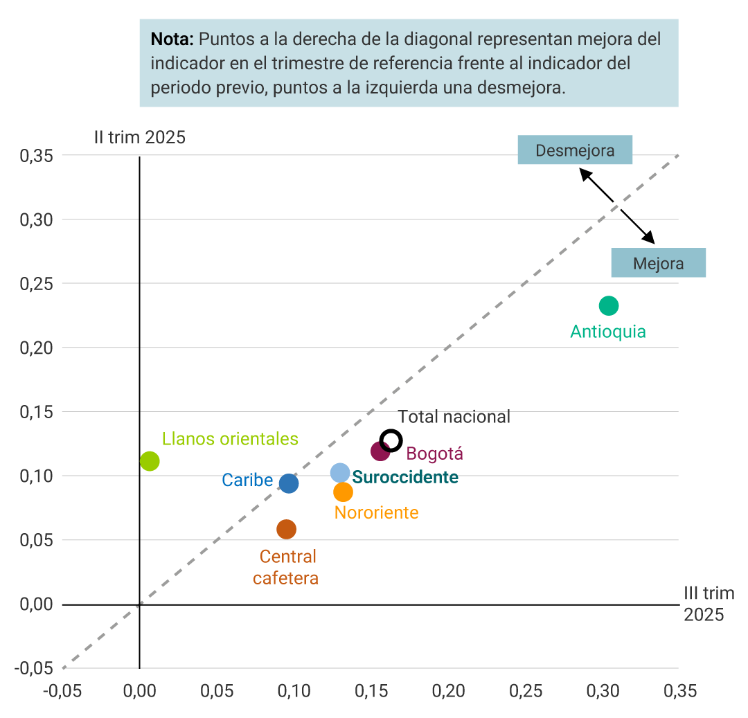 La mayoría de las regiones habrían mostrado incrementos superiores a los del trimestre anterior. En el caso de Antioquia, el crecimiento estaría vinculado a la dinámica del consumo interno, que habría impulsado avances en todas las actividades de seguimiento, según las percepciones de los empresarios de la región. Este mismo impulso del consumo habría favorecido el desempeño de Suroccidente, Nororiente, Central Cafetera y Bogotá, reflejado en mayores ventas del comercio interno, aumento de la producción industrial y de los desembolsos de crédito. Por su parte, el indicador de Caribe mantuvo un resultado positivo, explicado por el comportamiento del comercio y la manufactura, a pesar de la caída de la actividad agropecuaria, afectada por problemas fitosanitarios en algunos cultivos. En contraste, Llanos Orientales habría registrado el menor crecimiento, debido a las afectaciones del invierno sobre la producción agrícola e industrial, además del paro arrocero de julio y el cierre de la vía al Llano por derrumbes.
