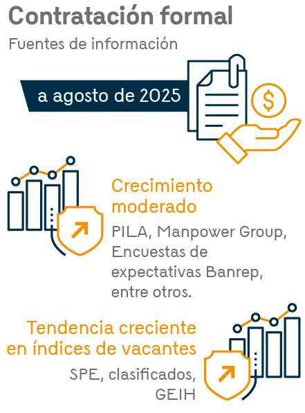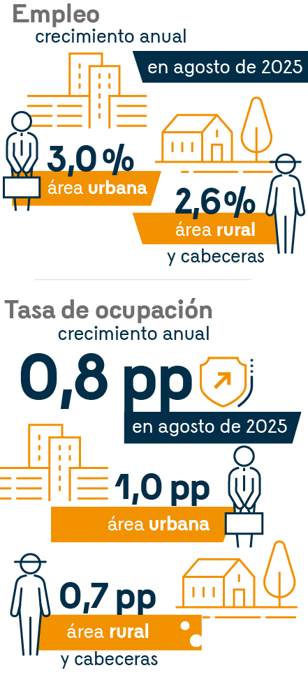 Según la Gran encuesta integrada de hogares (GEIH), al mes de agosto de 2025, el empleo nacional continuó creciendo. Este mejor dinamismo del empleo se explica, principalmente, por un mejor desempeño en el área urbana (crecimiento anual del 3,0%), seguido de las otras cabeceras y el área rural (crecimiento anual del 2,6%). Por tipo de empleo, se observa que en el último trimestre el segmento asalariado fue más dinámico que el segmento no asalariado. Por sectores económicos, aquellos que más contribuyeron al crecimiento del empleo fueron manufacturas, comercio y alojamiento.