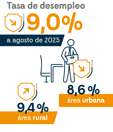 - La estabilidad en la participación laboral y el crecimiento en el empleo han permitido que la tasa de desempleo (TD) continúe cayendo, ubicándose al mes de agosto en el 9,0% y 8,6% en el dominio nacional y urbano, respectivamente.
