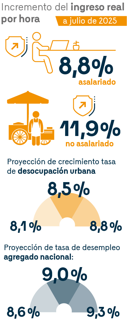 - Lo anterior va en línea con la dinámica de los ingresos reales por hora, que al mes de julio continuaron creciendo en un 8,8% para los asalariados y en un 11,9% para los no asalariados.